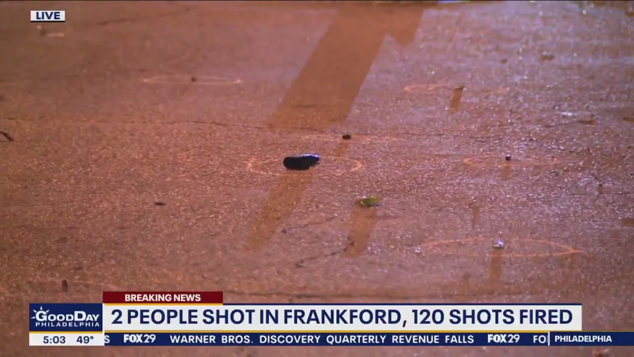 Two people were shot in Frankford in a shooting where more than 100 shots were fired, police say. FOX 29's Steve Keeley has the latest.