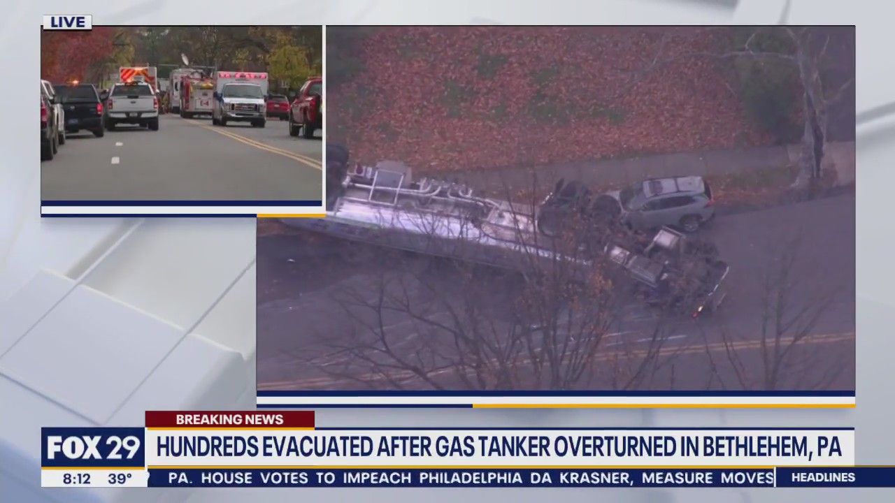 Hundreds of residents evacuated after gas tanker overturns in Bethlehem, Pa.