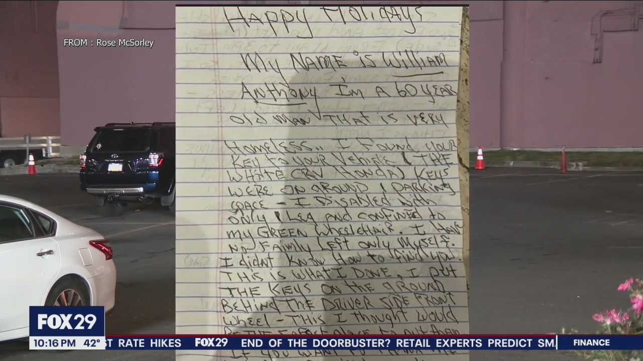 Family searching for homeless man who discovered woman's lost car keys in Philadelphia, returned them with note