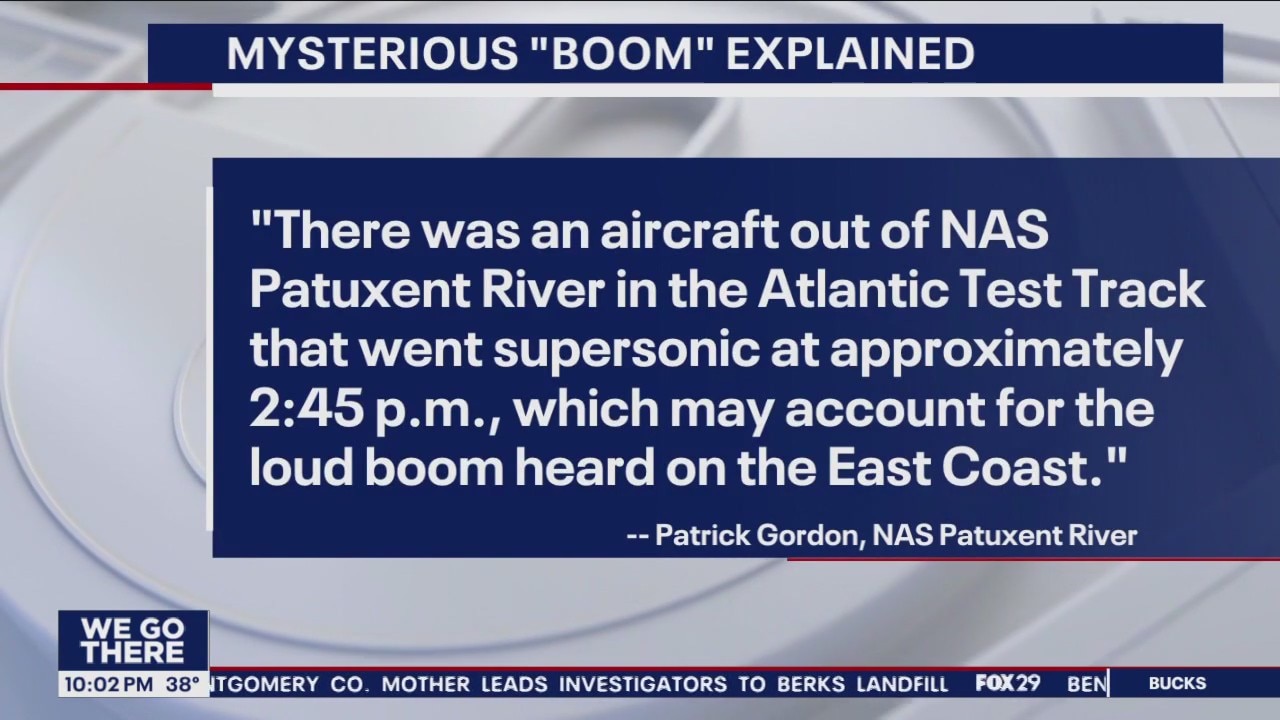 Military officials in Maryland believe an aircraft that went supersonic created loud booms that rumbled parts of New Jersey and Delaware Friday afternoon. A military spokesperson said while it's rare to experience sonic booms on land, certain conditions can make it possible.
