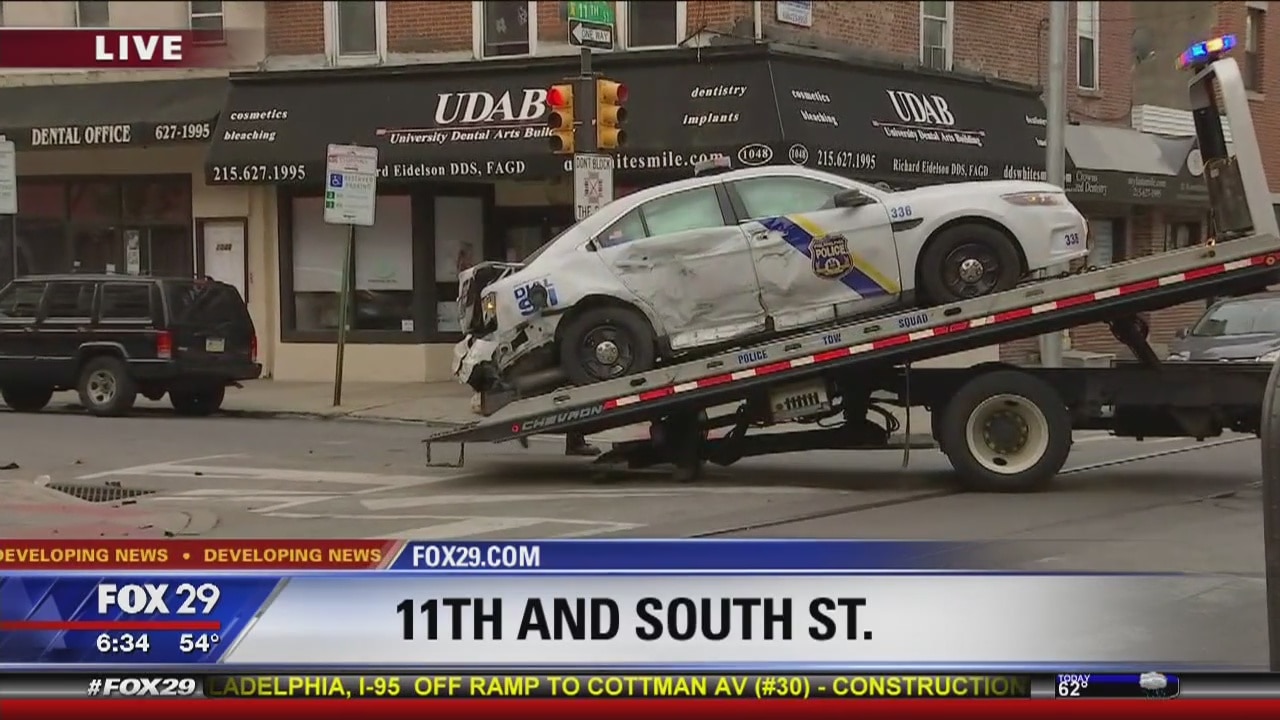 Police car being towed away after collision with bread truck