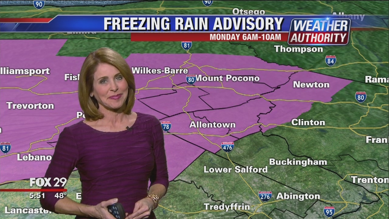 Meteorologist Kathy Orr has the Freezing Rain Advisory north of Philadelphia for early Monday, and the 7 day