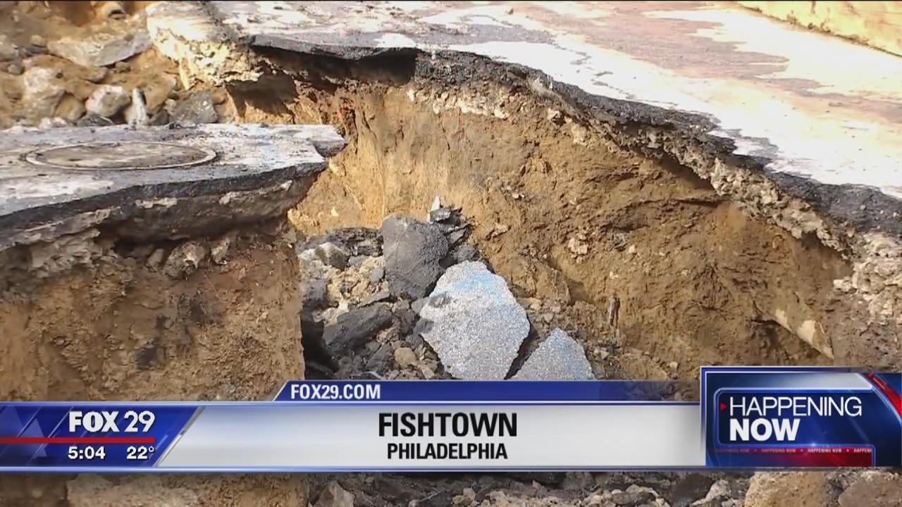 The Philadelphia Water Department is blaming a broken sewer line for the water main break that caused a large sinkhole to open and swallow two cars.