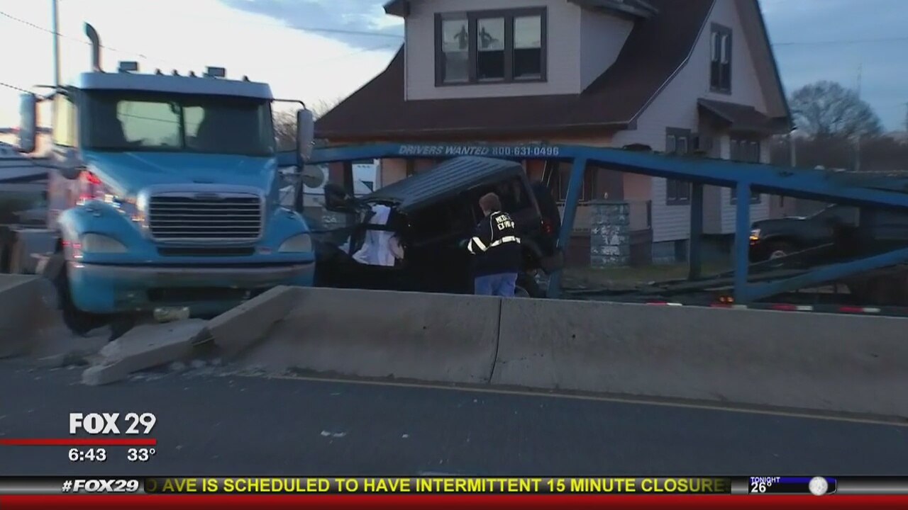 SUV apparently t-boned empty car carrier, medical examiner at scene investigating