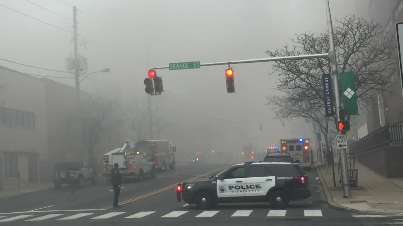 Smoky scene in downtown Wilmington when building went up in flames