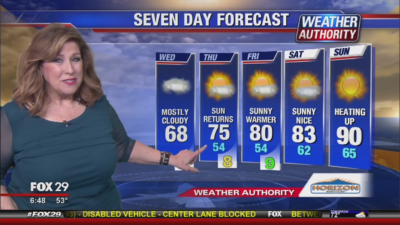 Sue Serio has the Wednesday forecast, plus the 7 day: Getting sunnier, warmer until heat wave