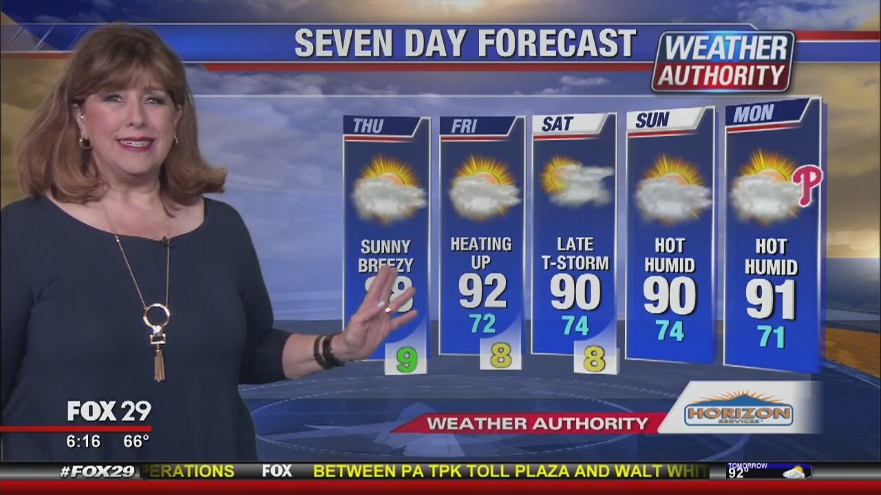 Sue Serio has the Thurs. forecast, plus weekend/holiday heat wave in the 7 day