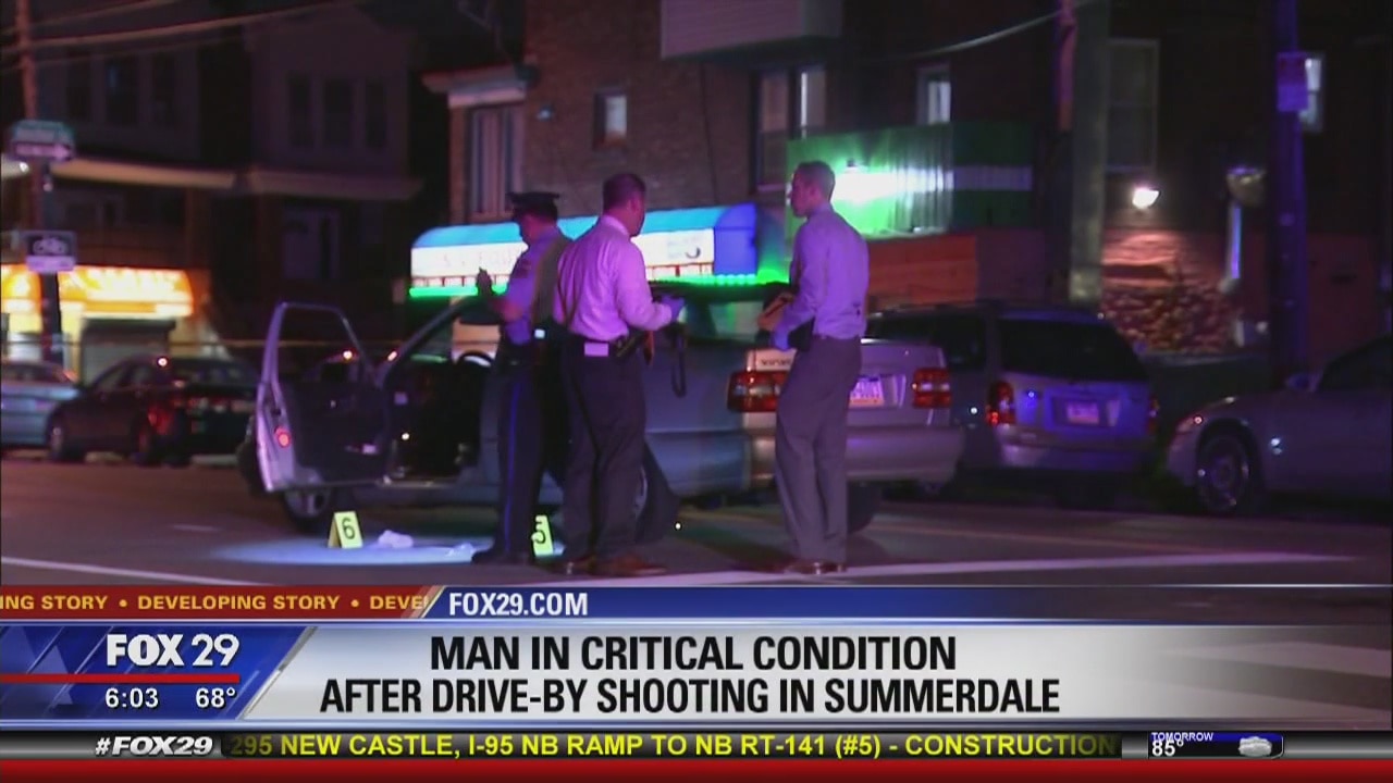 A 24-year-old man is in critical condition after police say he was shot in a drive-by shooting in the Philadelphia?s Summerdale neighborhood.