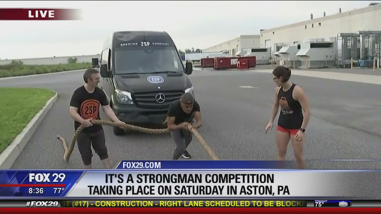 Quincy pulls a truck in preview for Beer Muscles Strongman competition
