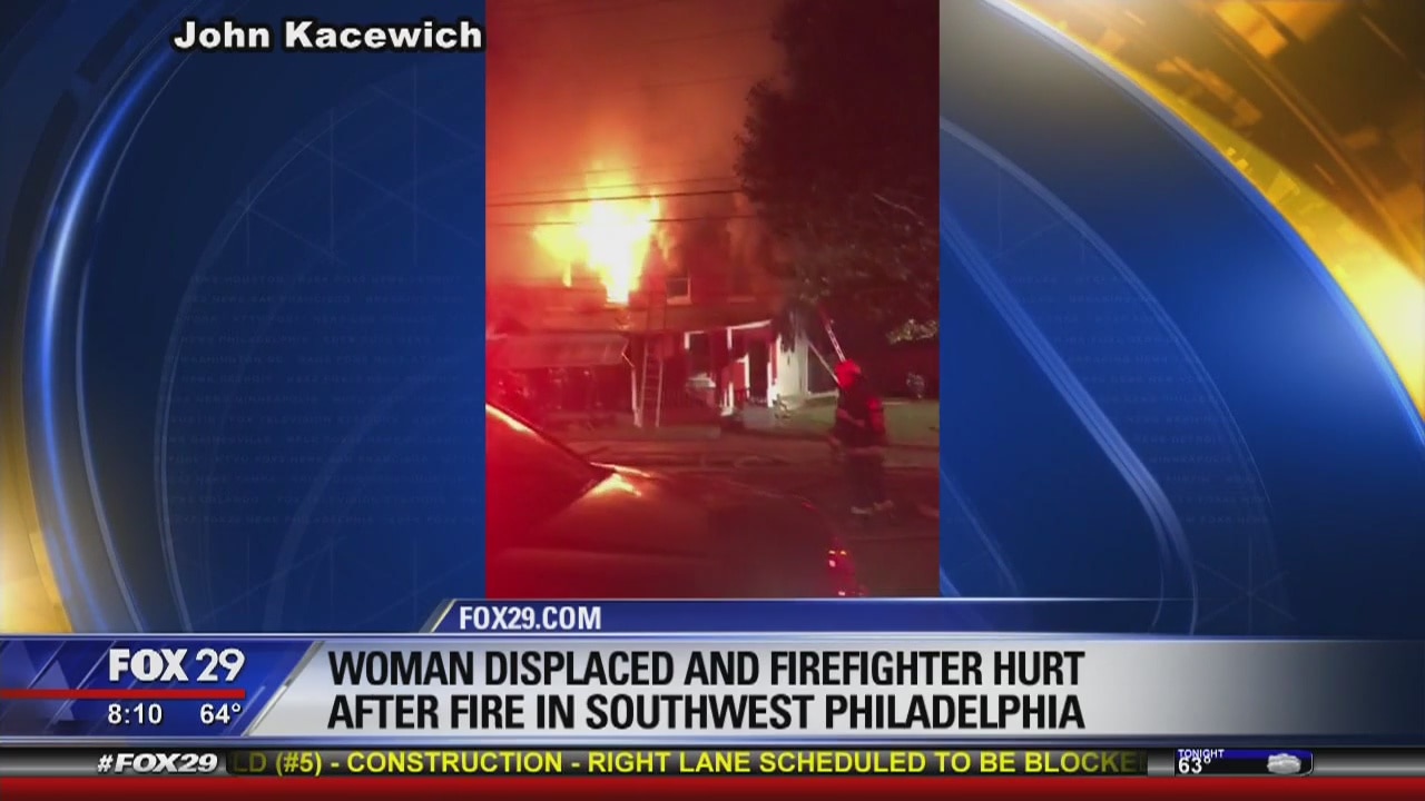 A fire in Southwest Philadelphia sent one firefighter to the hospital and forced a woman and her cat out of their home overnight.