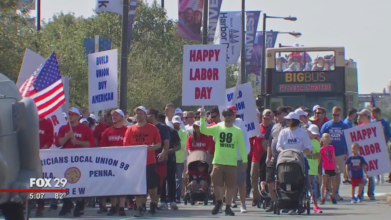 Union members and supporters march in Philadelphia's annual Labor Day parade
