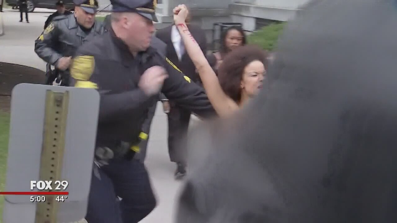 A topless protester who appeared on several episodes of "The Cosby Show" as a child jumped a barricade and got within a few feet of Bill Cosby on Monday as the comedian entered a suburban Philadelphia courthouse for the start of his sexual assault retrial.