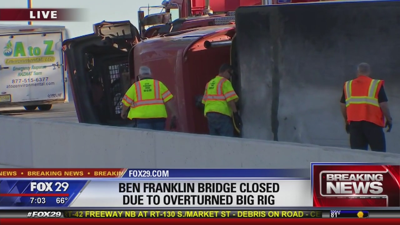 Commuter headache after tractor-trailer overturns at base of Benjamin Franklin Bridge