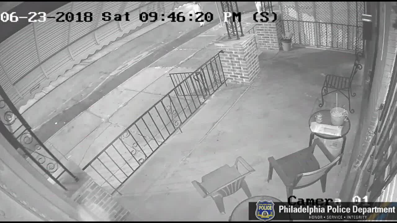 Philadelphia police are looking for two suspects after an explosive was thrown on the front porch of a home.