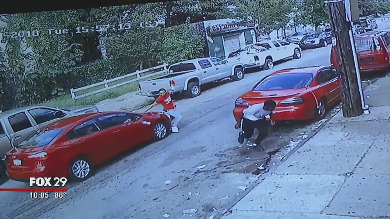 Police say they are searching for a gunman who chased down an alleged hit-and-run driver in North Philadelphia.