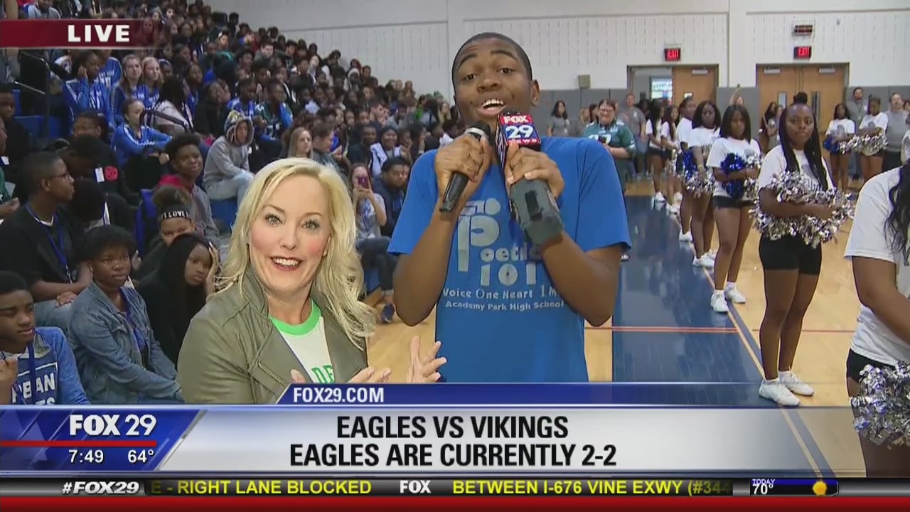 Jenn gets ready for the Eagles-Vikings game with Academy Park High School