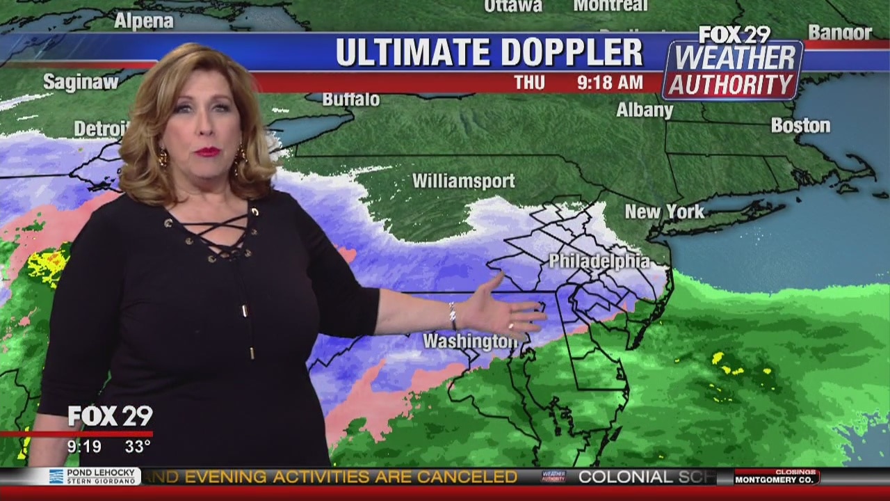 FOX 29's Sue Serio has a look at the latest conditions across the region as a wintry mix is in Thursday's forecast.