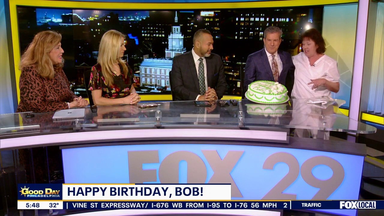 Fox 29's Bob Kelly is surprised by a birthday cake from Haegele's Bakery in Northeast Philadelphia.