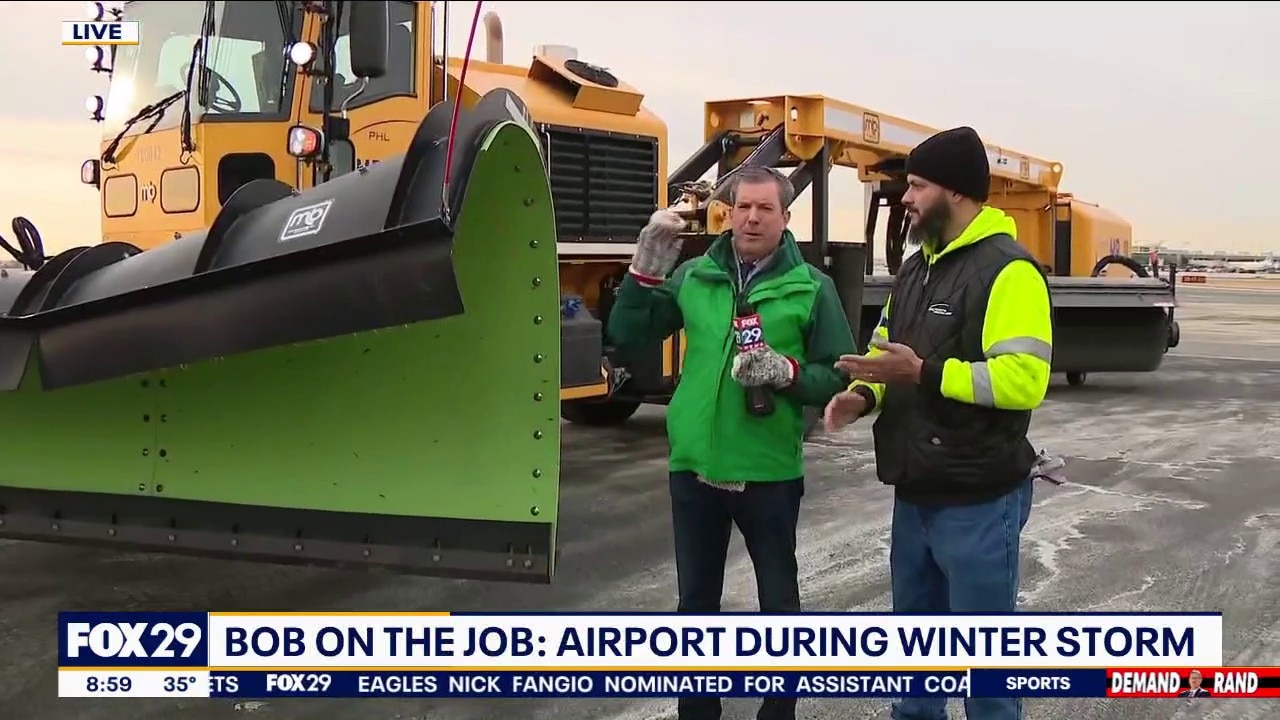 Fox 29's Bob Kelly helps workers at Philadelphia International Airport prepare for the snowstorm.