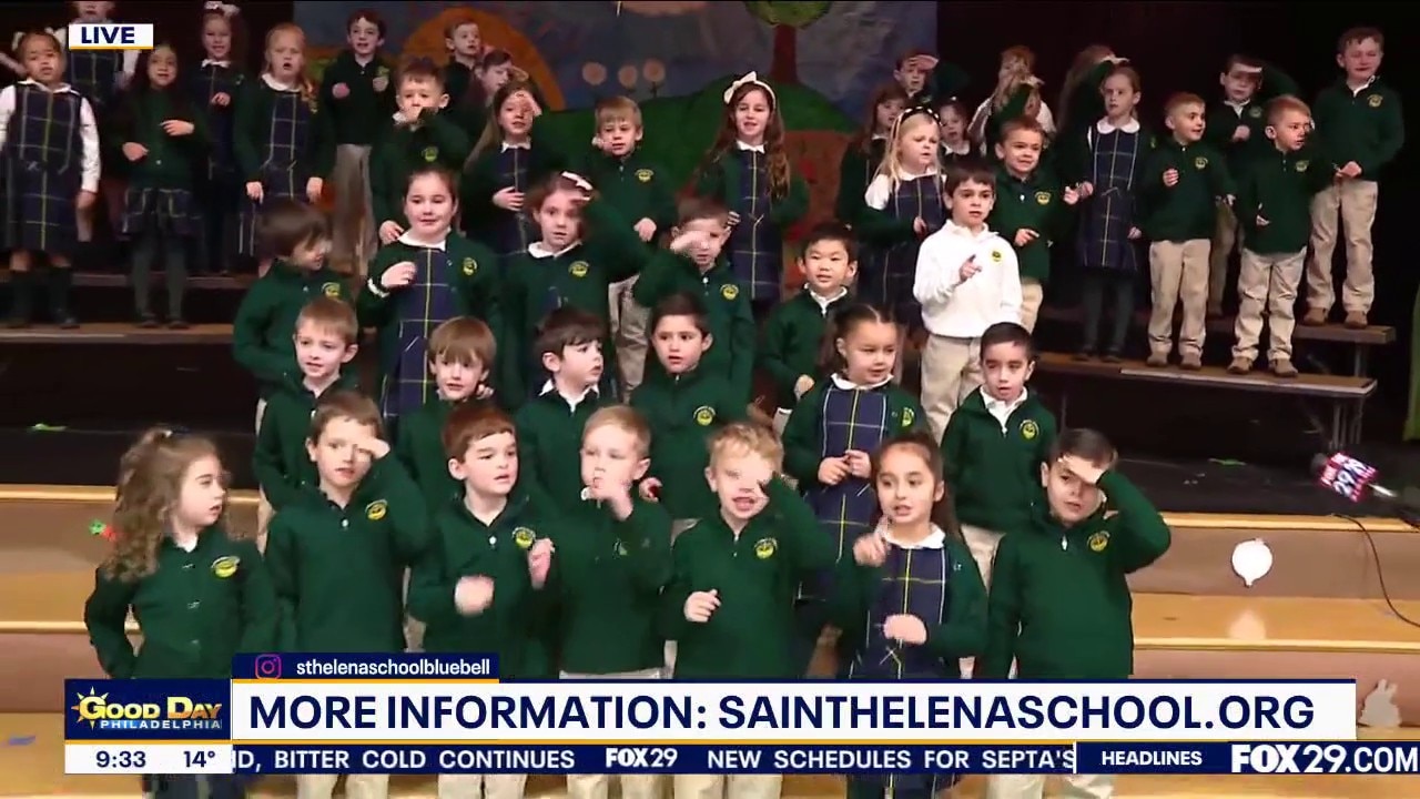 Fox 29's Bob Kelly joins in the festivities at St. Helena School in Blue Bell, PA.