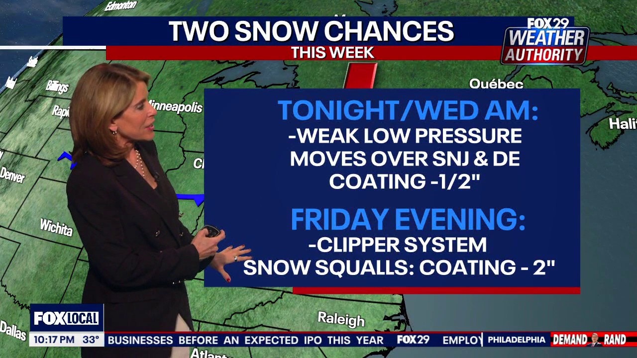 FOX 29 Meteorologist Kathy Orr breaks down the two chances of snow to expect in weather this week.