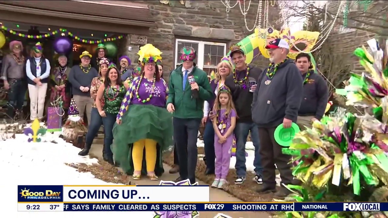 Fox 29's Bob Kelly joins a Mardi Gras house party in Drexel Hill, PA.