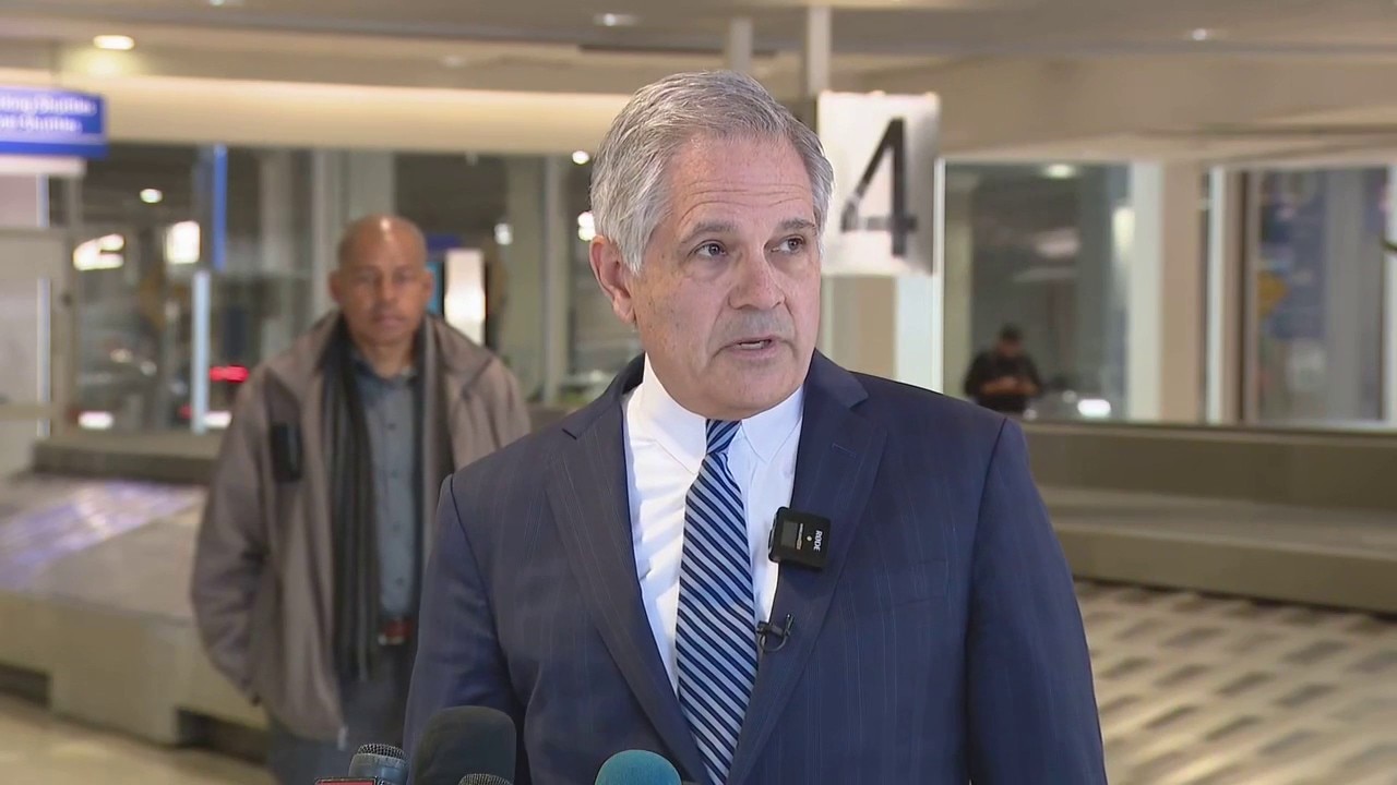 Philadelphia District Attorney Larry Krasner addressed reporters at the Philadelphia International Airport Tuesday as ICE agents had been deployed to assist with security operations amid the DHS shutdown.