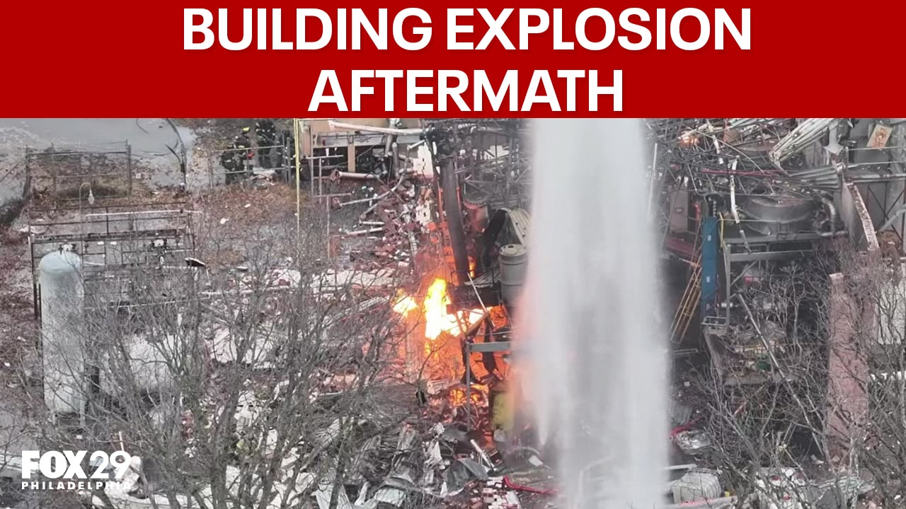 Drone footage share with FOX 29 News shows the aftermath of a building explosion in Logan Township that left at least five people hurt.