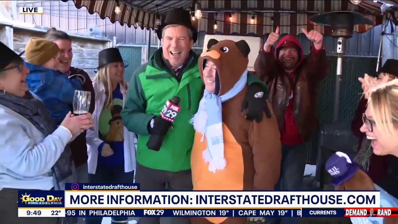 Fox 29's Bob Kelly attends a Groundhog Day party at Interstate Draft House in Fishtown.