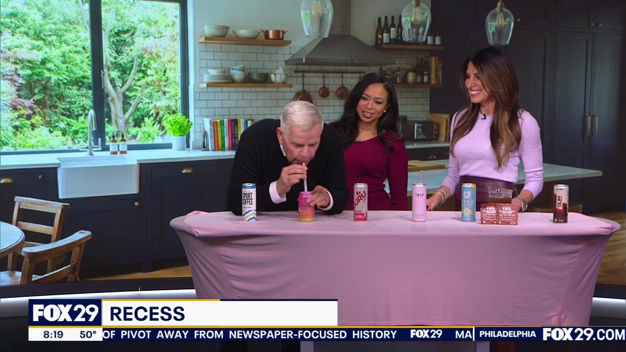 Dr. Nyree Dardarian, assistant clinical professor and nutritionist at Drexel University, joins Fox 29’s Mike Jerrick and Alex Holley in the studio to sample functional drinks that offer health benefits like improved focus, relaxation, better gut health, and increased energy.