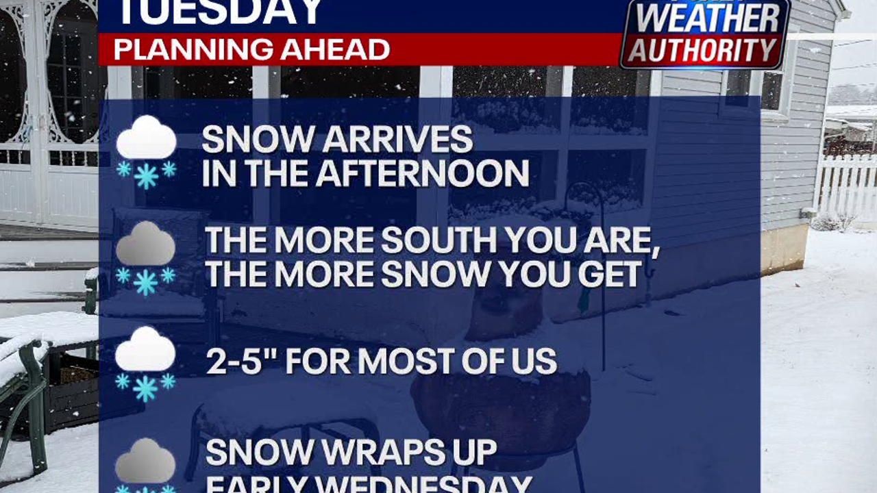 The snow will roll in Tuesday afternoon, and continue through the night, before wrapping up Wednesday morning.